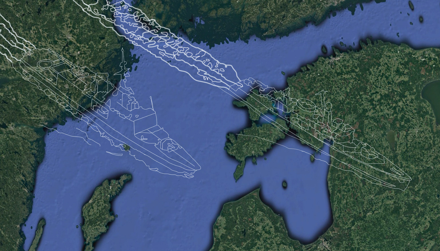 Ces deux tirages rejoignent une série débutée en 2006. Il s’agit d’un dessin numérique exécuté à la souris reprenant une scène s’étant déroulée sur un lieu identifié sur Google Earth. Dans ces deux cas, les dessins sont empruntés aux images de manœuvres militaires en Estonie et en mer Baltique, qu’il s’agisse de l’opération Lynx sur terre ou de l’opération Open Spirit sur mer. Bien que les images prennent leur source sur Internet, chaque pièce est un tirage unique.