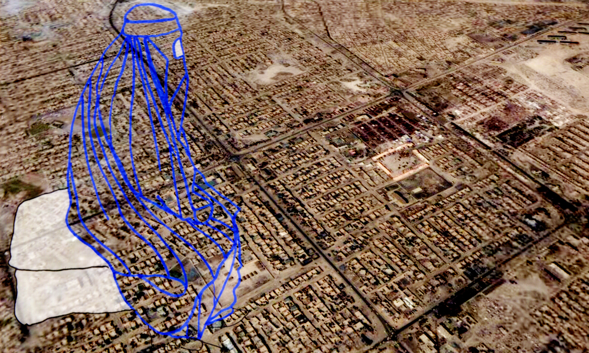 Une femme en burqa se reccueille sur l’immense tombe qu’est devenue Kaboul. On voudrait que cette image satellite de la capitale afghane renoue avec la beauté de la mosaïque arabe ou encore avec l’imaginaire des tapis volants.