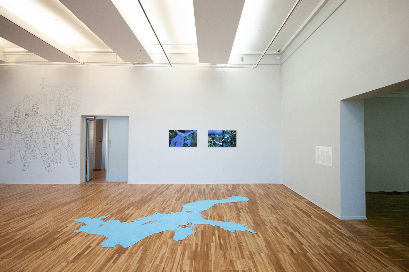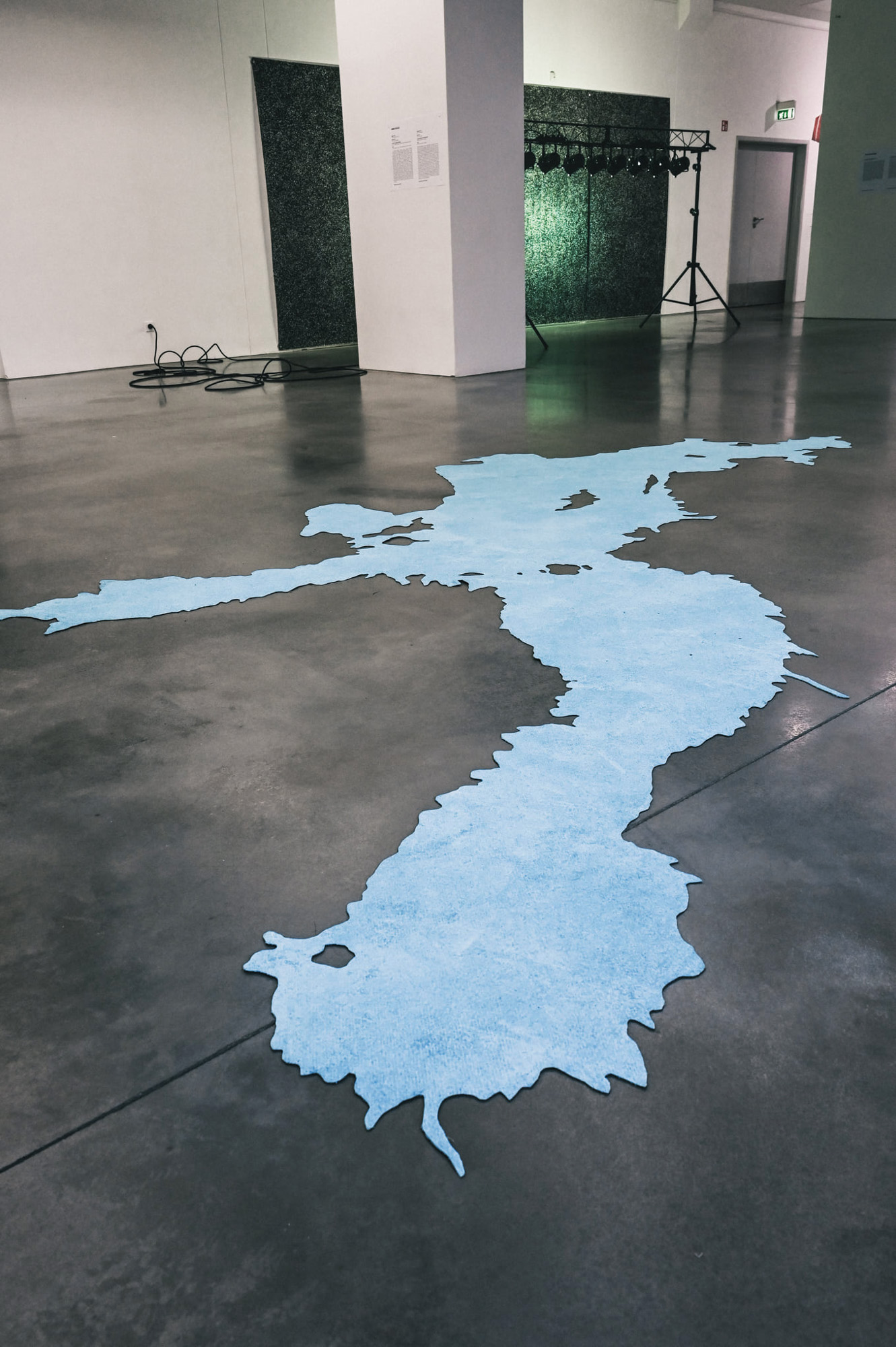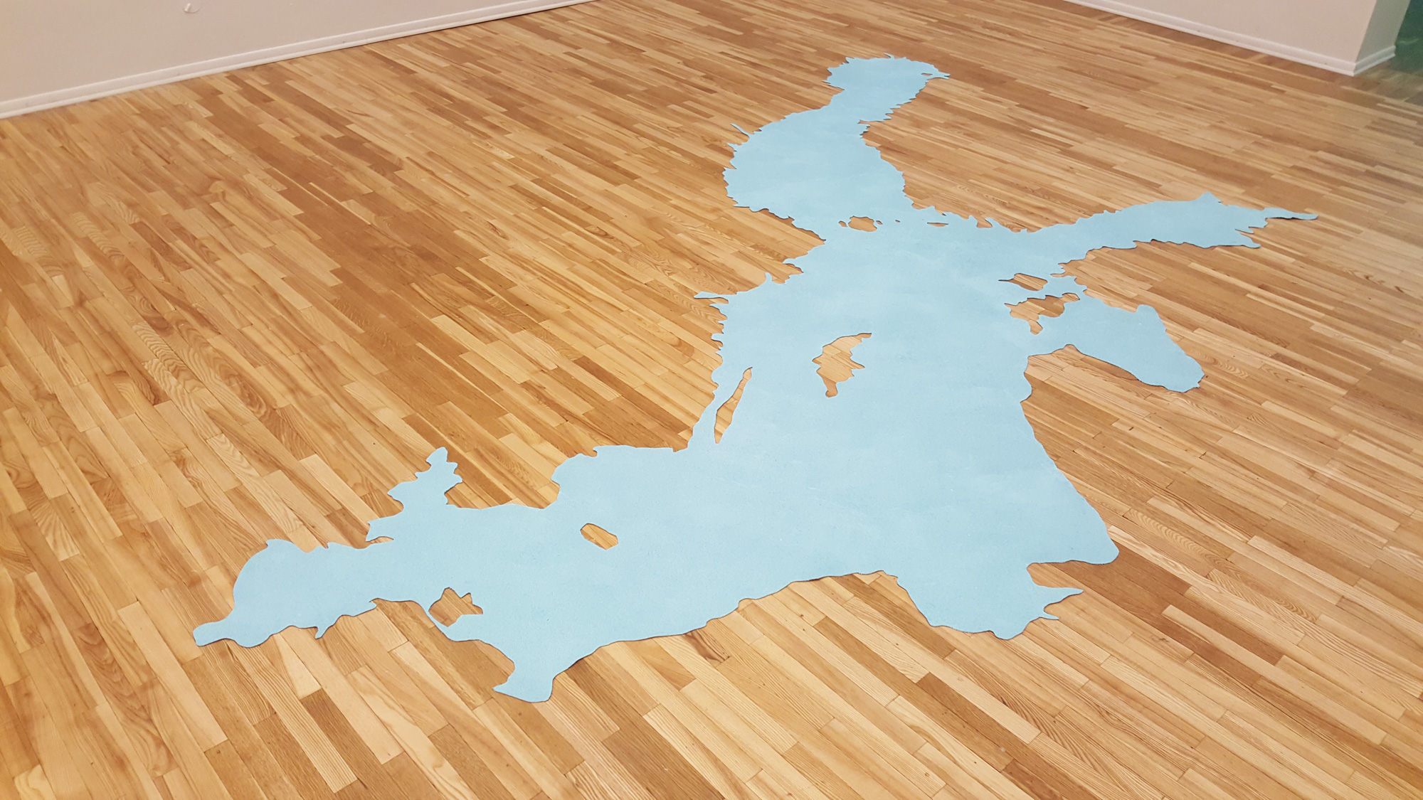 Si la vue surplombante n’est pas le seul apanage de la cartographie, c’est bien la cartographie qui en a étendu l’échelle du très petit au très grand. Avec l’invention de Google Earth, nous pouvons, plus facilement que le Géant Atlas, porter à bout de doigt le globe terrestre et ses paysages. Cependant, la cartographie reste un exercice à la hiérarchie bien déterminée, notamment pour ce qui concerne les formes des terres par opposition aux mers. Nous sommes toutes et tous capables de dessiner de mémoire les continents, mais personne ne garde l’empreinte des mers… En isolant la mer Baltique, ce travail au sol dessine en creux les frontières naturelles des côtes de ses pays dénuées ici de leur légende et de leurs douaniers.