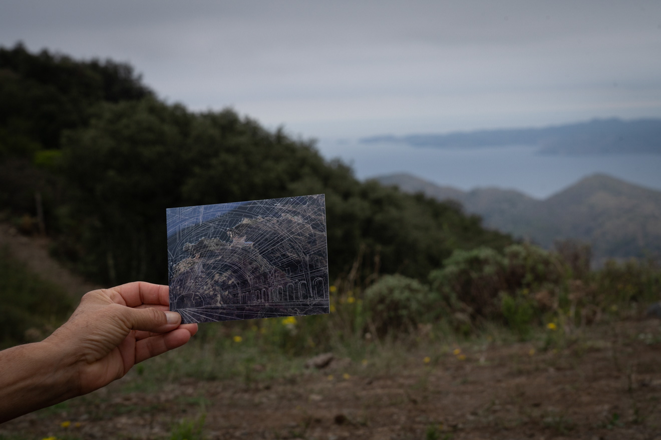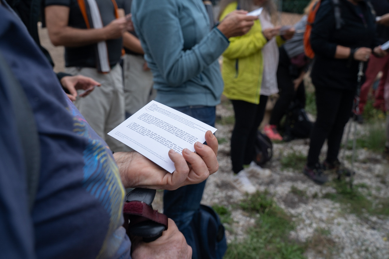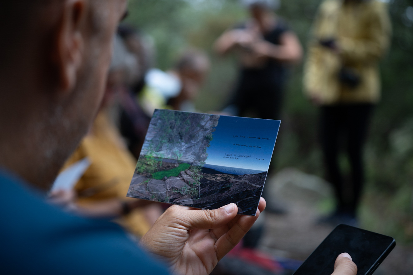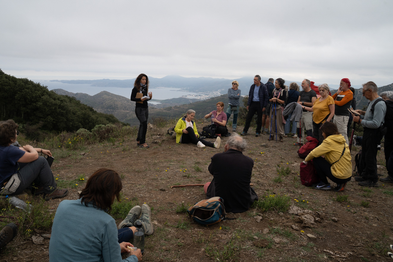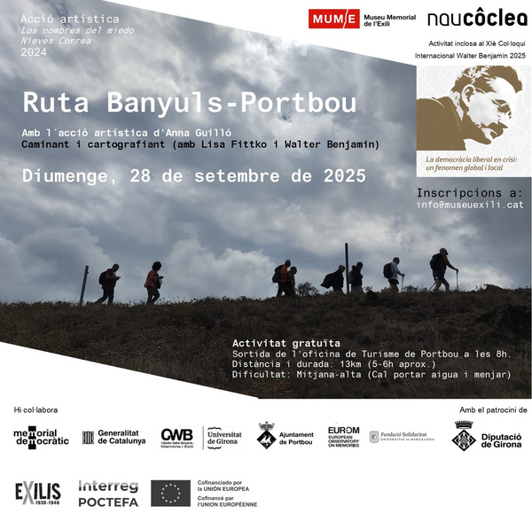 Dans le cadre de la Bourse de création Walter Benjamin 2025, cette marche effectuée sur le sentier Walter Benjamin entre Banyuls-sur-Mer et Port-Bou le 28 septembre 2025 a été ponctuée par la distribution de 5 cartes postales réalisées pour l’occasion. Chaque carte comporte, au dos, une citation de Lisa Fittko ou de Walter Benjamin écrite en catalan et en français.