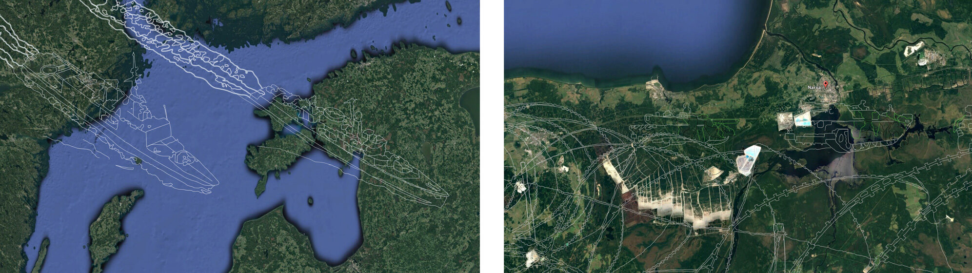 Ces deux tirages rejoignent une série débutée en 2006. Il s’agit d’un dessin numérique exécuté à la souris reprenant une scène s’étant déroulée sur un lieu identifié sur Google Earth. Dans ces deux cas, les dessins sont empruntés aux images de manœuvres militaires en Estonie et en mer Baltique, qu’il s’agisse de l’opération Lynx sur terre ou de l’opération Open Spirit sur mer. Bien que les images prennent leur source sur Internet, chaque pièce est un tirage unique.