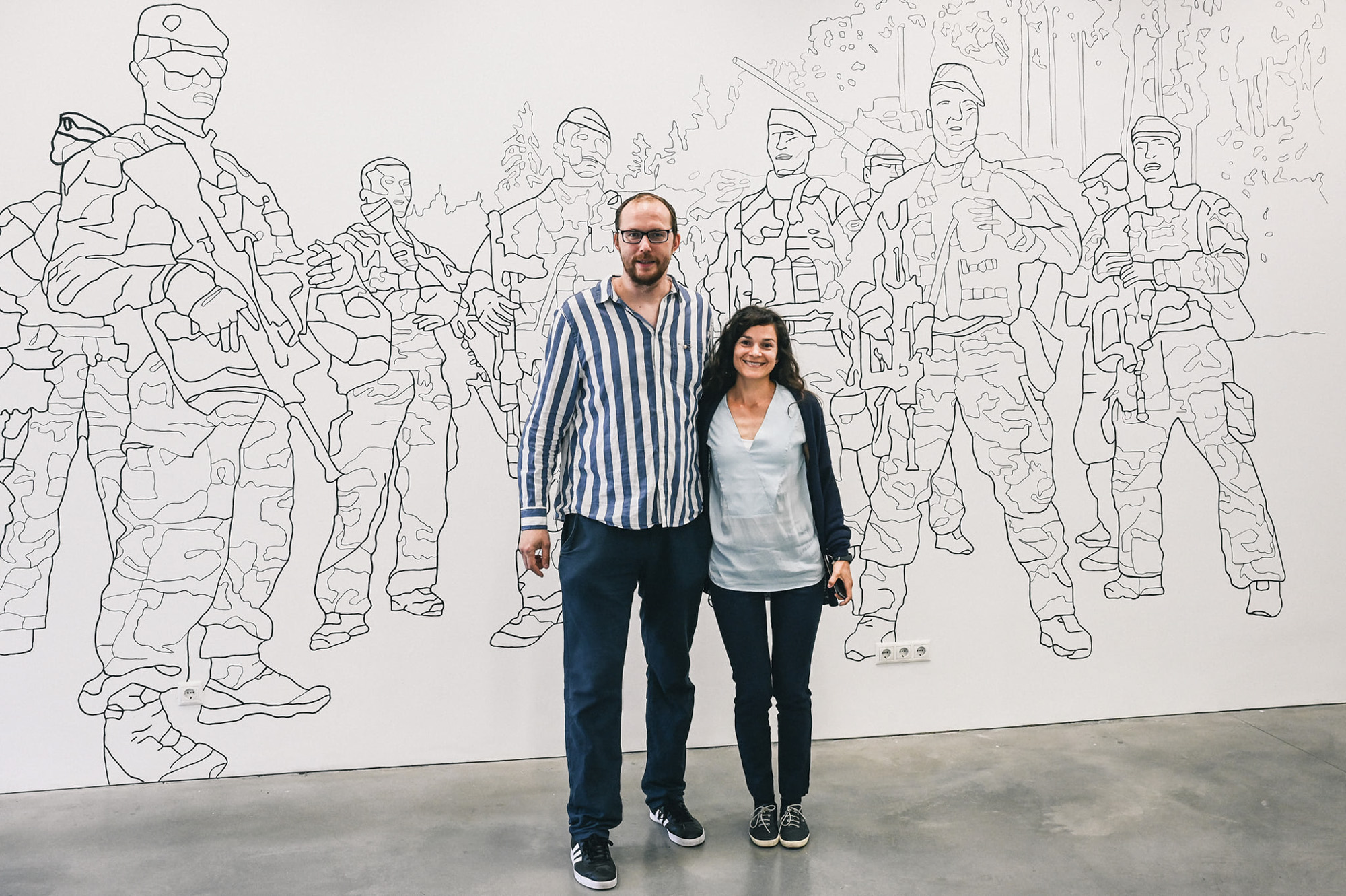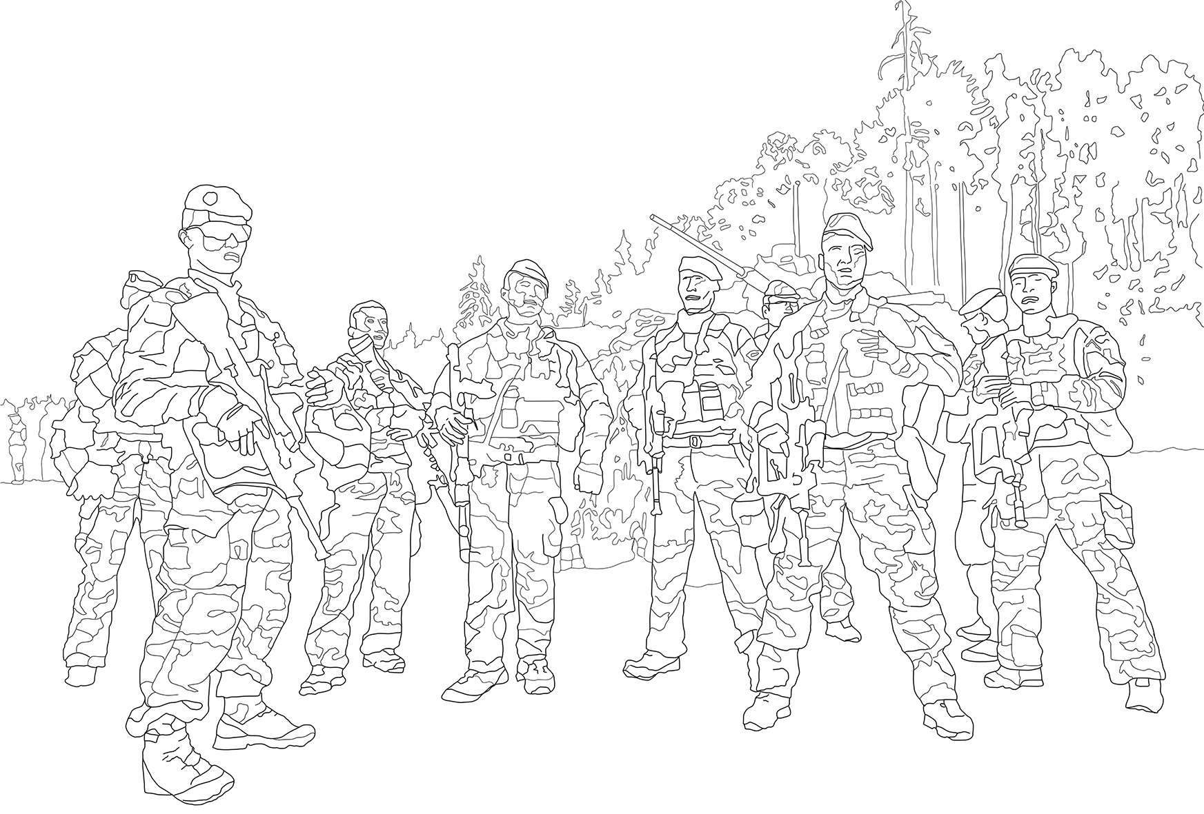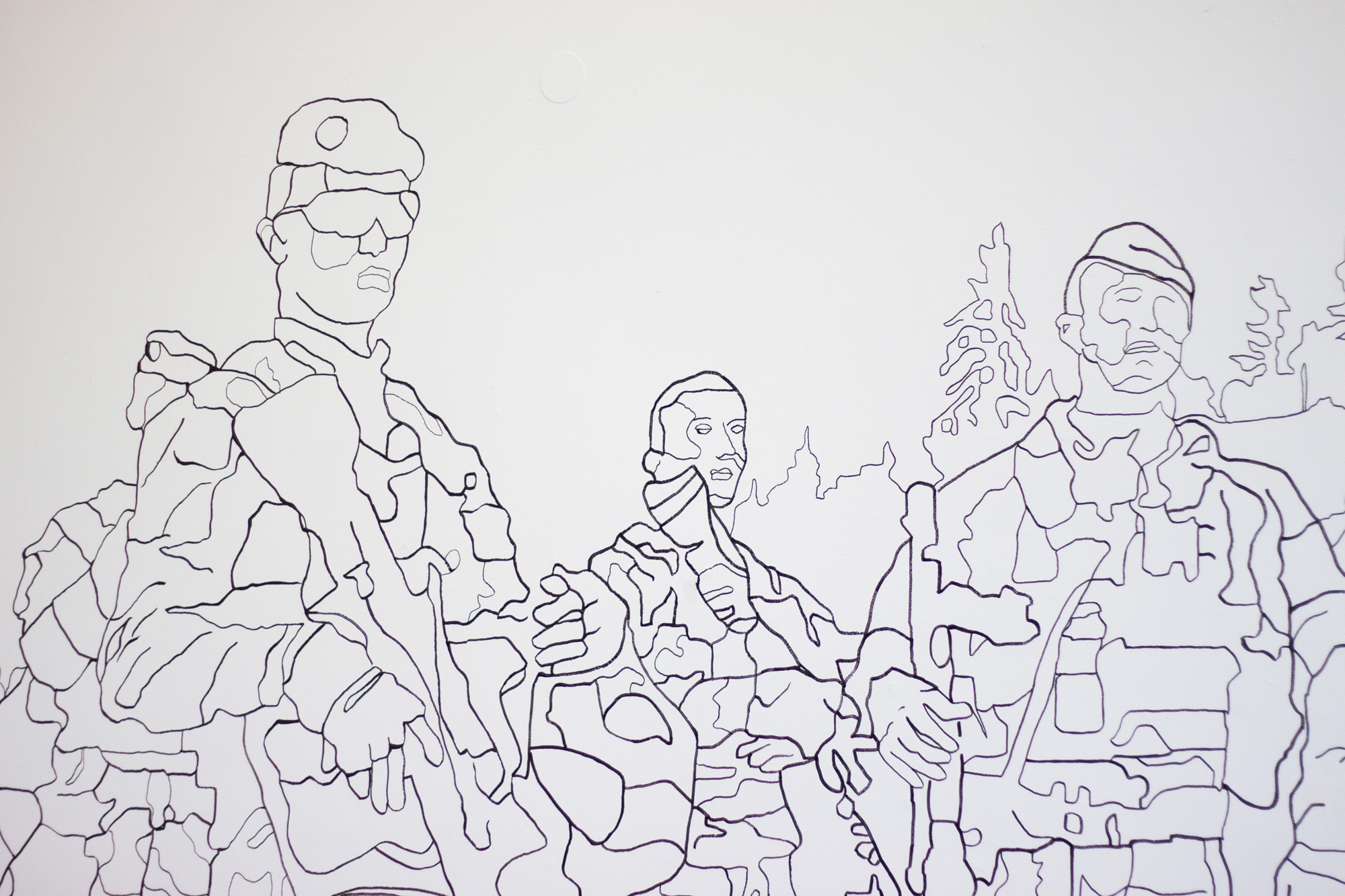 Les milliers d’images que nous cherchons sur Internet nous traversent à toute vitesse. En les transposant d’un support à l’autre, je leur donne une autre dimension, une autre matérialité mais aussi le temps long du dessin mural grand format. Passant de mon petit écran à la fixité d’un mur, les 300 soldats de l’opération Lynx avec leurs chars d’assaut se présentent ainsi comme une armée de spectres.