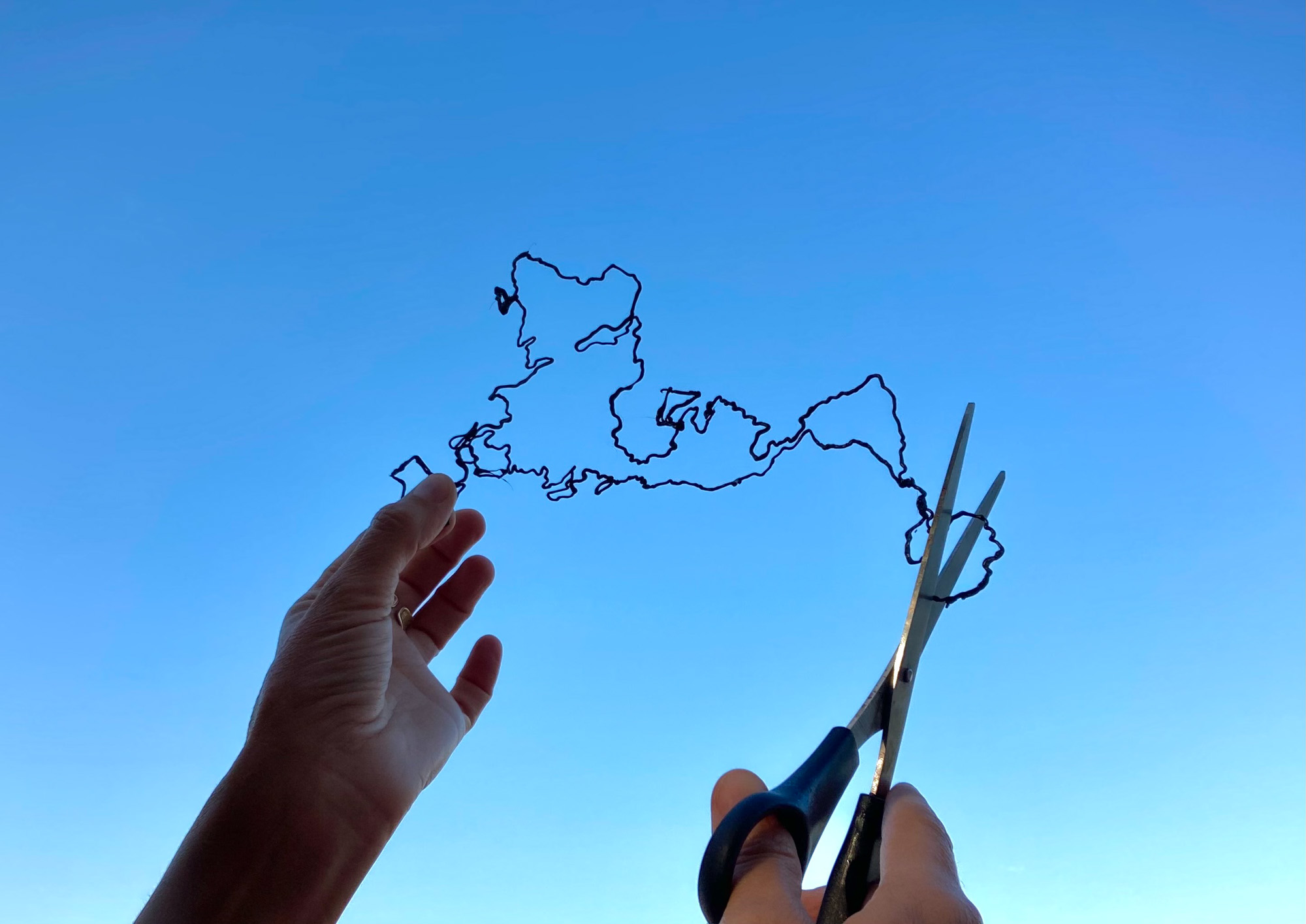 Photographie numérique d’une action de découpe de la projection de Buckminster Fuller dessinée au stylo 3D, cette image est l’emblème du projet de recherche-création collectif antiAtlas des épistémicides.